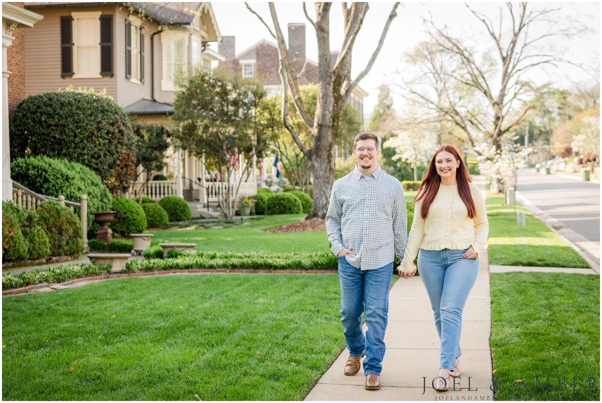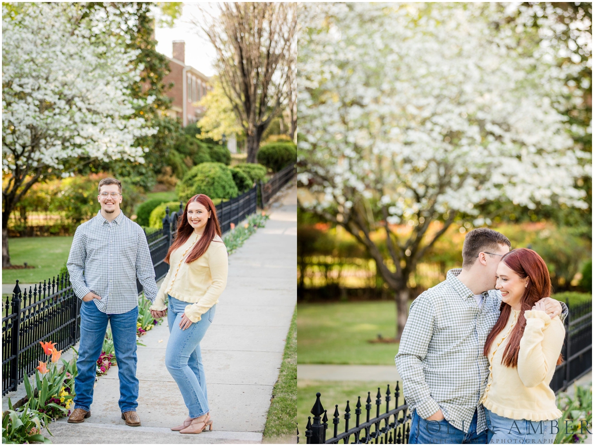 Allison and Aaron met us for their engagement session in downtown Huntsville’s Twickenham district. This one I will always stand on – it’s my absolute favorite engagement session location for an early spring engagement session. Golden light filtering through the early leaves. Stone walls down a tree-lined gravel path. Soft white blooms. All my spring session dreams coming true!